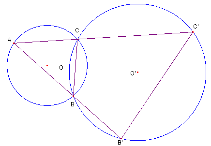 図のように、交わる2つの円O、O’があり、円Oの上の点Aから2円の交点であるB,Cとを結んだ直線が円O’と交わる点をB’、C’とする。