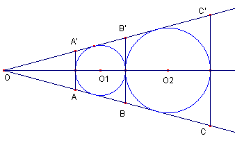 図のように、外接する2つの円O1、O2があります。その2つの円の中心線と、2つの円との交点での接線上の線分AA’、BB’、CC’の長さには、ある関係があります。また、それがなぜでしょう?