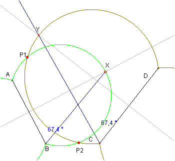 ∠ABX=∠DCYとなる点Yを線分CDの垂直二等分線上にとり、それが線分CDについて対象な点Y’を作図します。