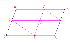 図のように、平行四辺形ABCDの辺BC上の点Pから辺ABに平行な直線を引き、辺ADとの交点をSとします。そして、点Sから直線ACに平行な直線を引き、辺CDとの交点をRとします。同様にして点Qを作図します。P,Q,R,S,Pと順に結びます。線分PSとQRの交点をOとします。