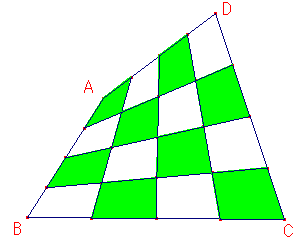 図のように、四角形ABCDの各辺を4等分する点をとり、図のように結び、四角形をABCDを16に分割します。