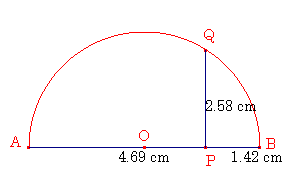 図のように、ABを直径とする半円Oがある。AB上の点Pを通る垂線と弧ABとの交点をQとする。