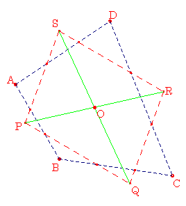 図のように、四角形ABCDの各辺の3等分点を結び、四角形PQRSを作図し、その対角線の交点Oを作図します。