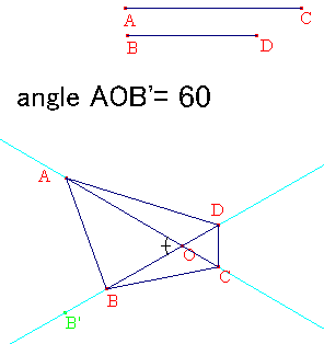 図のように、長さが一定の線分AC,BDを延長したとき、図のような角度で交わっている。