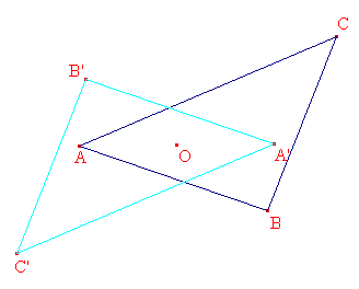 △ABCを点Oについて点対称移動し、△A’B’C’をつくります。