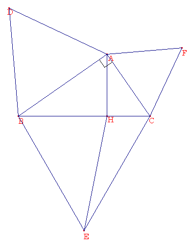 左の図のように、∠Aが直角である直角三角形ABCの3つの辺を1辺とする正三角形があり、AHとBCが垂直であるとき、△BEH、△CEHはどのような性質があるでしょうか。