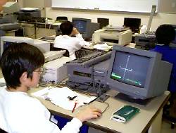 線分の垂直二等分線がコンパスを使って作図したことから、角の二等分線も同様にコンパスでかく方法を用いて、「GC」で調べさせる。 「GC」の利用は2度目になるが、移動可能な点の数を多く設定してあるので、簡単にその移動方法を説明する。 |