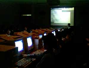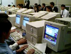 ○オーサリングツールの基本機能を教師がプロジェクター上に教師用コンピュータの画面を映し、その画面を見ながら、自分でも平行して操作を進める。 オブジェクトページの作成、背景色の設定、フィールドの作成の方法等を知らせる。 ○ページを増やす方法を知らせ、フィールドの複製をする練習をする。 ○3ページ目に自分のテキストデータを取り込む。 テキスト形式にしていない場合は、使えないので、後で、教師が変換してあげることを知らせる。それまでは、他の生徒の活動を参考に見ているように知らせる。 長いテキストの場合は、フィールドのプロパティを設定し、スクロールバーを付加する。 ○4ページ目にスキャナーで取り込んだ画像を取り込む。 使用できる画像フォーマットも限られるので、変換が必要な場合は、後に教師が変換方法を知らせるか、変換してあげることを知らせる。多くのフォーマットが使えるが、BMPもしくはGIFを使用するように知らせる。画像サイズもあらかじめ変更する必要があるため、後に変更する方法を伝えることを知らせる。 ○一人ひとりがページ作成の練習を行う。本時の段階では、資料をすべて揃た生徒はいないため、本時は、終了時にページを保存する必要はないことを知らせる。 生徒は、百科事典、東海道53次について開設した本、検索結果をブックマークに登録しておき、インターネット(東海道53次クイズ)等の文章や画像データを使用する。 |