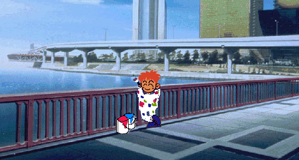 カラフルな服でしょ。今日は、お父さんの仕事の手伝いでペンキ塗りをしているんだ。