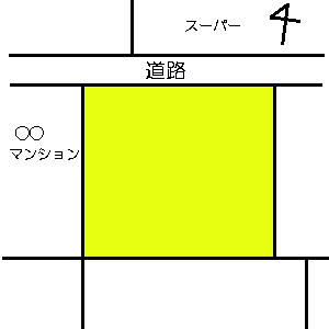 「美容院を建てたいそうで、道路に面したところに50坪ほど、欲しいそうです。できるだけ、道路に面している部分を広くとり、駐車場スペースも欲しいそうです。また、売り主さんも100坪ほど、残したいそうでして、全部で210坪あり、どのように土地を分割したものか困っているんです。 また、売り主さんも後ほど、半分にして売るかもしれないし、その土地に自分の家を建てるかもしれないので、どちらにも対応できるようにしたいそうです。 また、どの土地も道路に2m接していなくてはなりません。車も入れませんしね。4つに分割する場合もその条件を満たすようにしておきたいのですが・・・・。」 「私の方としては、南側にマンションなどができると困るので、できるだけ北側に建物を建て、南側に少しでも空いている部分をとりたいんです。」 「つまり、できるだけ、南北に長く土地をとりたいんですね。」 「はい、それから、3階建てにしたいので、法律上問題ないだけでなく、北側の方の日当たりが悪くても、あまり迷惑にならないようにしたいのです。」 「北側は10m道路だし、スーパーも南側は駐車場だから、ちょうど良いですね。お客さんの条件にぴったりですね。あとは、土地の分割方法ですね。」 | ![]() |