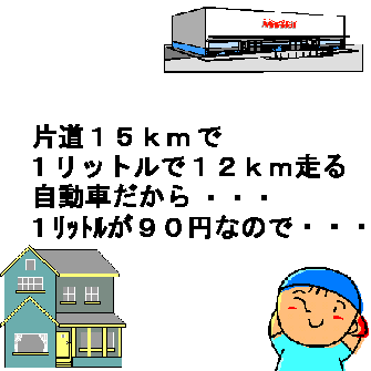 母さんの自動車は1リットルで12km走る自動車で、1リットルが90円だから、結局、母さんは