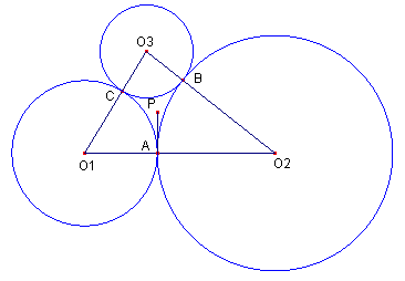 There are three circles which contact each other. How do you draw the third circle? Three common tangents cross at point P. The radius of circle O1 is a.The radius of circle O2 is b.The radius of circle O3 is c.The distance between point P and point of contact is t. What is the relation between a, b, c and t? Move point A to find the geometric relation betweeen the triangle ABD and the triangle BCD. @You can move points O1, O2, A, P on CABRI. |