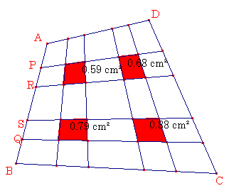 @There is a quadrilateral. The length of AP is same the length of BQ. The length of AR is same the length of BS. The ratio of AB is same the ratio of the other sides(BC,CD,DA). Move points(A,B,C,D,P,R) to find the geometric quality between the red areas and the area of quadrilateral ABCD. |