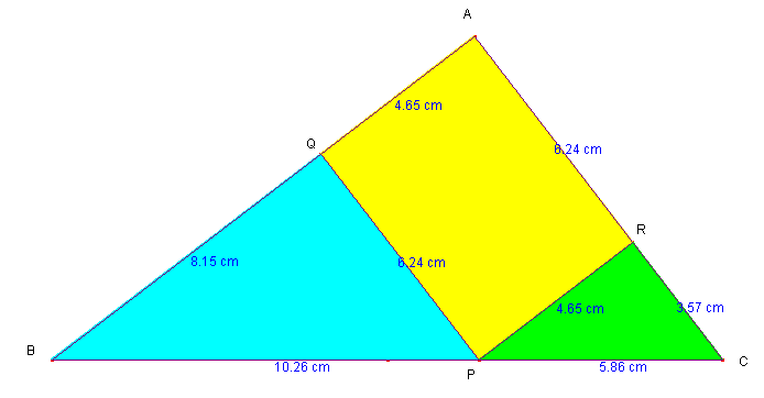 CABRIUを使って、そのきまりがいつでも成り立つか、底辺上の点Pを動かして確かめてみよう。