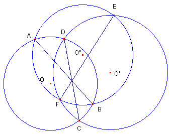 図のように、交わる3つの円O、O’、O’’があり、2円に共通な弦をAB、CD、EFとする。ただし、3円は、3つの円に共通な部分ができるように交わるとする。