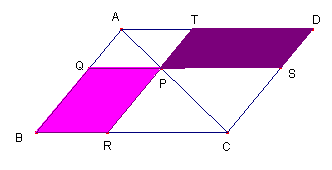 図のように、平行四辺形ABCDの対角線AC上の点Pを通り、AB,ADに平行な直線TR、QSを引くとき、四角形BRPQと四角形PSDTの間にはどのような関係があるでしょうか?また、それはどうしてでしょうか?