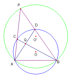 図のように、2つの円O、O’の交わるとき、その交点をA,Bとし、円O'上にCがあります。このとき、点PA,PBと円Oとの交点をC,Dとし、BC,ADの交点をQ、AC,BDを延長し、その交点をPとします。
