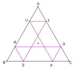 図のように、正三角形ABCの辺BC上の点Pから辺ABに平行な直線を引き、辺ACとの交点をQとします。そして、同様にして点R,S,T,U,を作図します。P,Q,R,S,T,U,Pと順に結びます。
