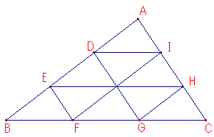 図のように、三角形ABCの各辺を3等分する点をとり、図のように結び、三角形ABCを分割します。