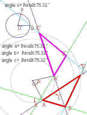 このとき、直線ABと直線A’B’、直線BCと直線B’C’、直線CAと直線C’A’の交わる角をそれぞれ、∠a、∠b、∠cとします。