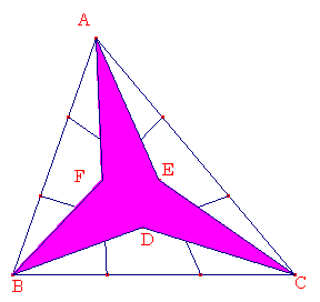 三角形ABCの3つの頂点をその対辺の三等分結び、内部に多角形AFBDCEをつくる。