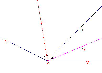 左の図のように、∠XABの二等分線がAP、∠YABの二等分線がAQであるとき、∠PAQはどのような性質があるでしょうか。