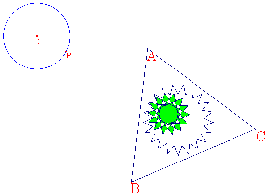 △ABCの内部の歯車に沿って、△ABCは回転します。このとき、頂点A,B,Cはどのように動くでしょうか。