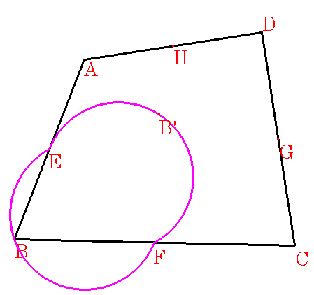 四角形ABCDの各辺の中点を図のようにE,F,G,Hとします。このとき、図のように線分EFに対して、弧EBFと対象な弧を描きます。