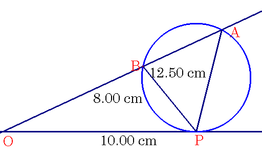 図のように△ABPの外接円に点Pで接する接線があり、ABとの交点をOとなっています。このとき、OA,OB,OPにはどのような関係があるでしょうか。