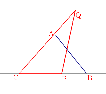 直線OB上に点Pがあり、△ABOと△PQOの面積が等しいとき、辺OA,OB,OP,OQの長さはどのような関係があるでしょうか。