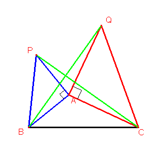 △ABCの辺AB,辺AC上に図のような直角二等辺三角形をつくるとき,PCとBQはどのような関係があるでしょうか。