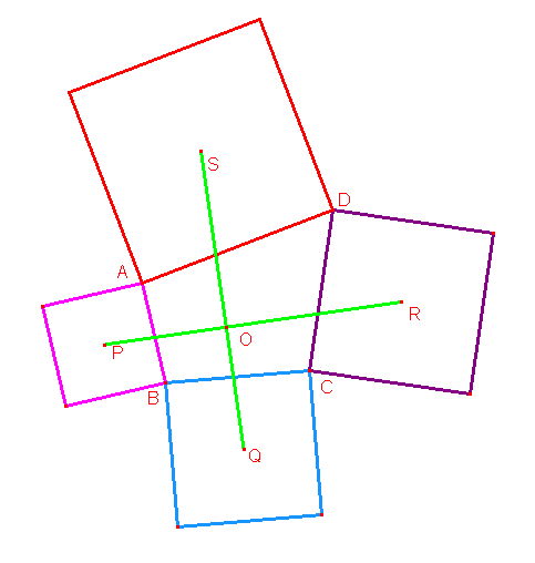 四角形ABCDの各辺の上に図のような正方形をつくり,その正方形の対角線の交点をP,Q,R,Sとします。