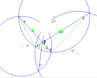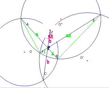 次に、下の図を見てください。 図のようにPCをbとします。 そして、CPの延長上にax/bとなる点D’をとります。 すると、△PD’E∽△PFCになるから、 ∠PD’E=∠PFCなので、点D’は円O’上にあるといえる。 同様にして、点D’は円O上にあるといえる。 したがって、点D’は円O’とOの交点だから 証明終わり。 |
