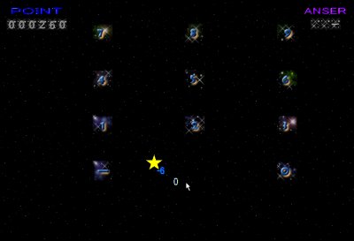 <概要> 正の数・負の数の加法の計算ゲームです。 2個〜10個の数の和を求めます。 マウスカーソルを数字が追いかけてきます。 それらの数字の和を計算し、その回答を入力します。 数字の後から追いかけてくる★を使って数値を入力します。マウスカーソルを動かし、★を誘導します。そして、例えば「−12」の場合は、★が順に「−」、「1」、「2」を通過するように誘導します。 入力した結果が、右上に表示されます。 正解の場合、メッセージが表示され、次の問題に進むことができます。次第に難度が高くなっていきます。10個の数字の場合の問題をすべて解くと終了となります。 |